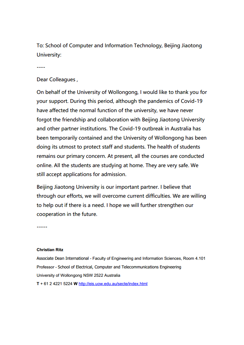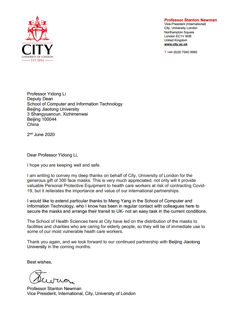 伍伦贡大学电子,计算机与电信工程学院副院长Christian Ritz教授在信中写到,“我代表伍伦贡大学,感谢您的支持。这段时间,尽管新冠肺炎已经影响了我校的基本运转功能,但我们从未忘记和今年会jinnianhui官网的友谊和合作”,“今年会jinnianhui官网是我们的重要合作伙伴。我相信我们可以共渡难关,如果贵校需要任何帮助,我们一定伸出援手。我希望在未来进一步加强双方合作”。伦敦城市大学副校长Stanton Newman教授在信中写到,“我代表伦敦城市大学向您表示深深的感谢,您慷慨捐赠的口罩不仅向奋战在抗击新冠肺炎一线的工作人员提供了宝贵的个人防护物资,更是重申了我们国际合作关系的重要性和价值”,“我想特别感谢今年会jinnianhui官网的杨萌女士,她和我的同事们多次沟通,最终将口罩顺利寄到了英国,在目前的情况下这不是一件容易的事”。