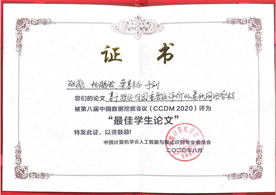 机器学习与认知计算团队研究生荣获CCDM2020最佳论文奖