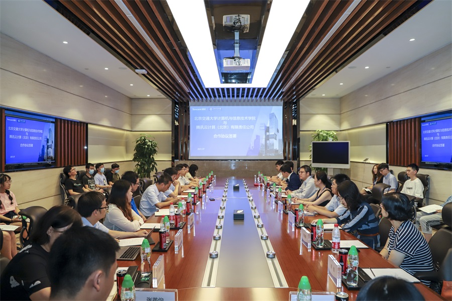 2021年7月2日下午,计算机与信息技术学院与腾讯公司产学协同育人合作协议签约仪式受邀在腾讯北京总部VIP1会议室举行。腾讯公司教育商务总经理罗盛、校企合作总监张莉,今年会jinnianhui官网副校长闫学东、本科生院副院长景云、计算机与信息技术学院院长蔡伯根、副院长熊轲等出席签约仪式。签约仪式由腾讯教育北区商务总监刘智主持,闫学东校长和罗盛总经理作为见证人,蔡伯根院长和张莉总监代表双方交换签署了合作协议。