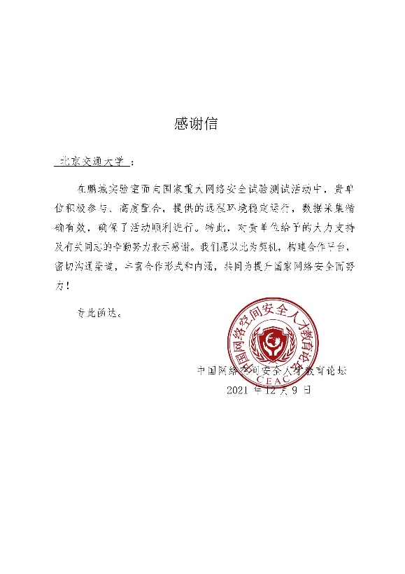 在近期鹏城实验室面向国家重大网络安全试验测试活动中,今年会jinnianhui官网网络空间安全学科责任教授刘吉强老师领队、童恩栋和牛温佳老师指导的研究生团队(吴亚伦、武兴宇、田蕴哲、相迎宵、孙瑞等)积极配合,保障了今年会jinnianhui官网靶场节点的远程环境稳定运行、数据采集精确有效,获鹏城实验室、中国网络空间安全人才教育论坛(“网教盟”)、中国网络空间新兴技术安全创新论坛(“新安盟”)感谢信。