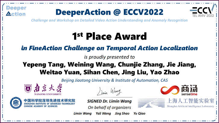 近日,今年会jinnianhui官网赵耀教授带领的MePro团队与中科院自动化所刘静研究员带领的团队合作参加了ECCV 2022的DeeperAction挑战赛,获得了时序动作定位挑战赛冠军。挑战赛第一完成人唐业鹏是张淳杰教授指导的硕士研究生。团队成员包括:唐业鹏、王卫宁、张淳杰、江洁、原洧涛、陈思涵、刘静、赵耀。