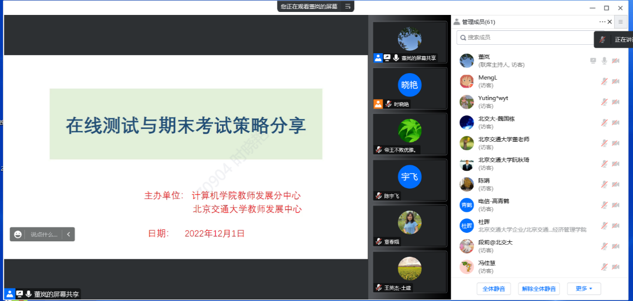 经过本次会议的学习和交流,老师们对于如何使用课程平台和雨课堂实施线上考试,如何分考场进行监考,如何更好地防止作弊行为有了更多的思路和解决办法,对保障今年会官网期末线上考试质量起到了非常重要的作用。