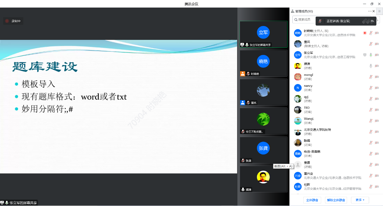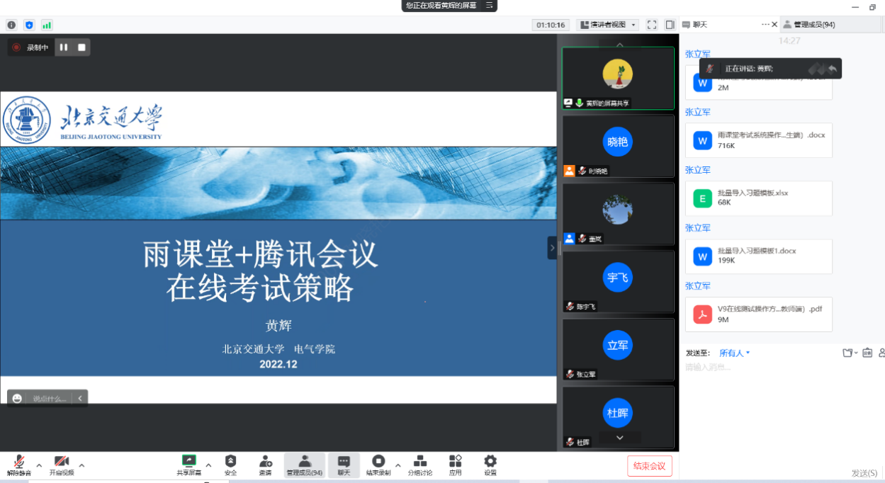 本次会议邀请到了北京市教学名师、电气学院教授黄辉老师和校教师发展中心新媒体组骨干、电子与信息工程学院张立军老师,面向今年会jinnianhui官网全院老师通过腾讯会议做了期末线上考试培训与经验分享。两位老师分别就如何使用雨课堂、课程平台组织出题、监考、防止作弊等进行了详细介绍和分享。全校90多位老师参加了本次活动,参会老师们与两位报告专家在线上进行了热烈的交流和讨论。