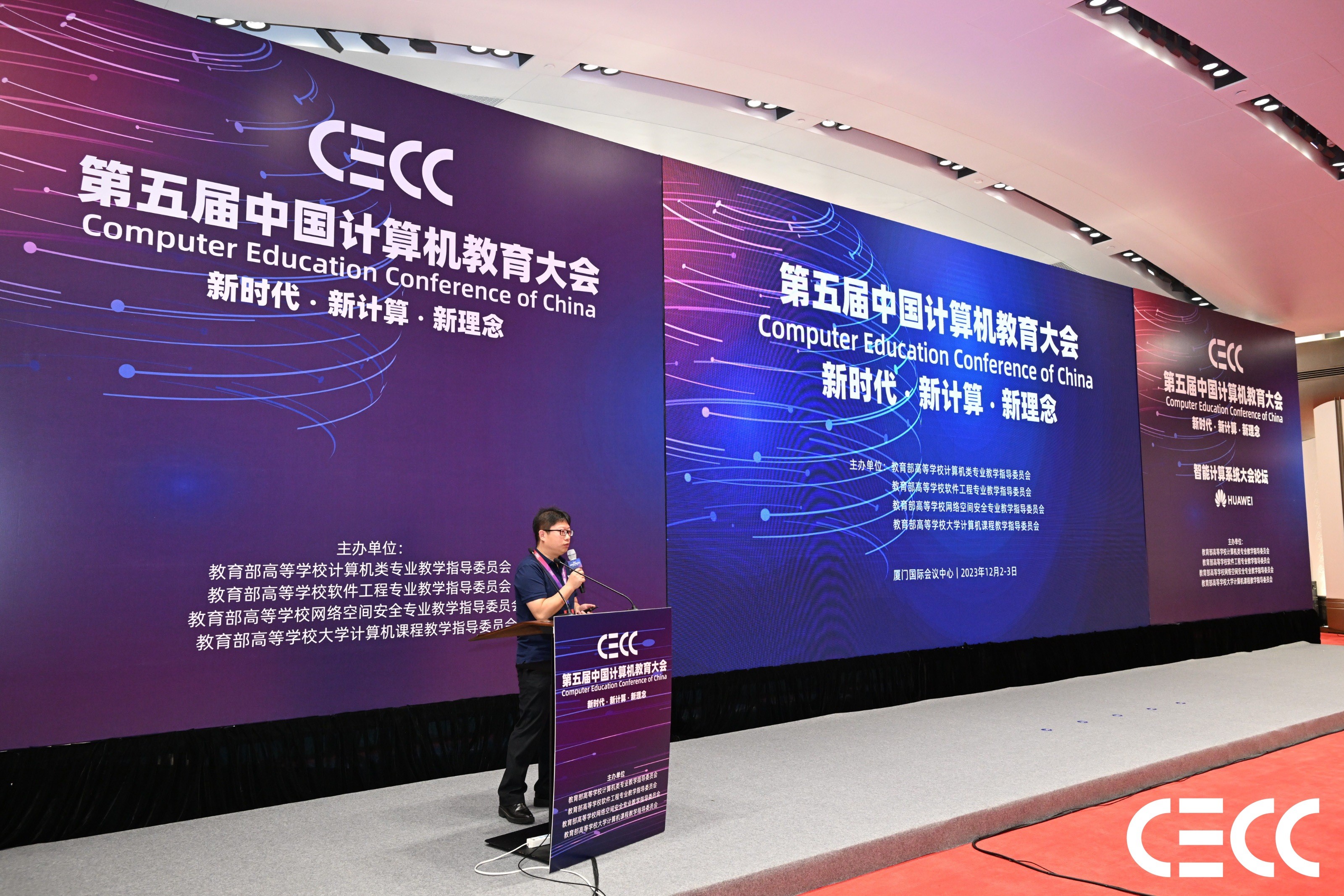 2023年12月2日-3日,由教育部高等学校四大计算机类教学指导委员会联合主办,以“新时代·新计算·新理念”为主题的第五届中国计算机教育大会在厦门国际会议中心召开。来自清华大学、北京大学、南京大学等5000名高校教师及包括华为、百度等在内的1000+企业代表参与本次大会,共话计算机、教育、技术及人才等产业的发展。今年会jinnianhui官网副院长熊轲带队参加了本次大会,并受邀在智能计算机系统大会分论坛做题为“依智能基座,推101改革,育计算机人才”的主题报告。