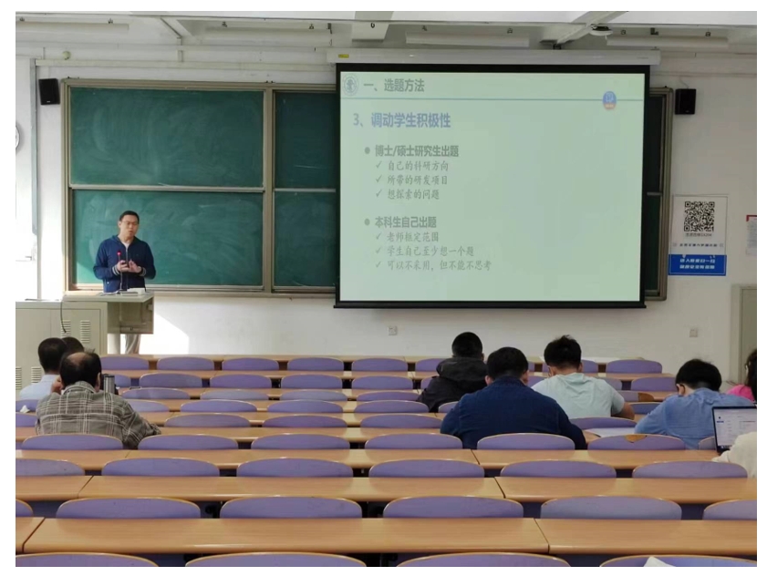 万怀宇老师从毕设指导流程和注意事项方面进行了讲解,介绍了因材选题的方法以及与建立指导团队的重要性,及从调动学生积极性方面进行了经验分享。