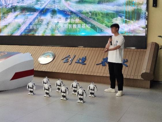 在成果展中,人工智能与未来交通技术科普基地的大学生科普志愿者,展演了"AI + 轨道运维"的虚拟仿真系统、巡检车拼搭模型,以及机器人编舞项目。他们使用自研的高铁轨道巡检虚拟仿真实验为同学们科普人工智能和智慧交通的前沿知识;巡检车纸板模型的拼搭活动让同学们更能理解高铁轨道智能巡检车的结构和工作原理;精巧互动的桌面机器人的自然流畅舞蹈,诠释了人工智能基础技术的魅力。师生们被前沿科技深深吸引,踊跃体验,意犹未尽。