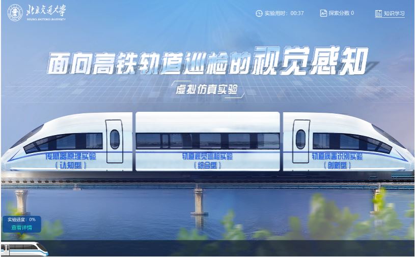 在实践活动中,教师团队精心准备了技术讲解、虚拟仿真实验、快问快答、实验室参观等丰富有趣的环节。利用自主研发并上线国家虚仿实验空间(ilab-x)的“面向高铁轨道巡检的视觉感知虚拟仿真实验”,设置了循序渐进的三个模块学习内容:“认知—传感器”模块,了解铁路发展历程、传承高铁精神,熟悉轨道基础设施构成,掌握巡检用视觉传感器工作原理及巡检方法;“系统—轨道巡检视觉感知”模块,了解视觉感知系统的构建方法,执行不同环境下的轨道巡检任务;“智能—轨道病害识别”模块,了解基于机器视觉以及自主研发“天佑大模型”轨道病害识别工作原理,体验病害识别的程序设计和实现流程。
